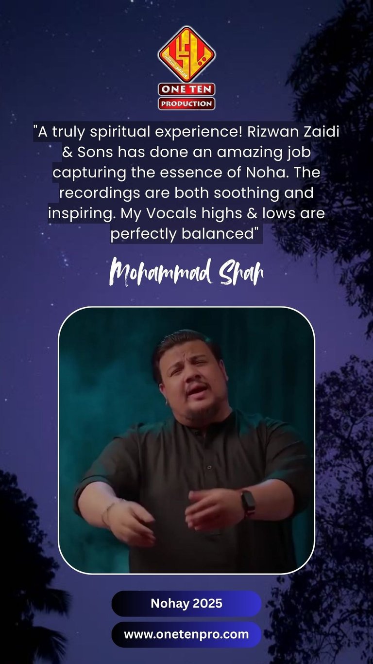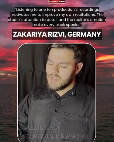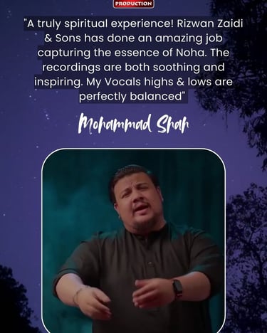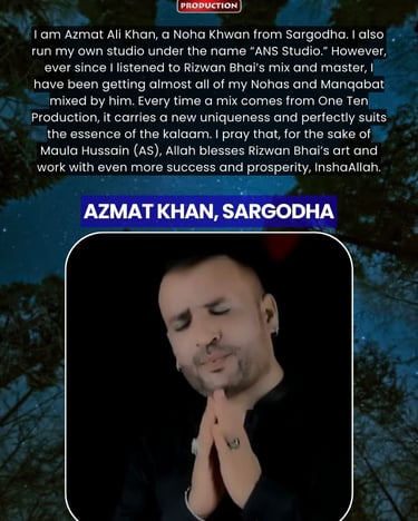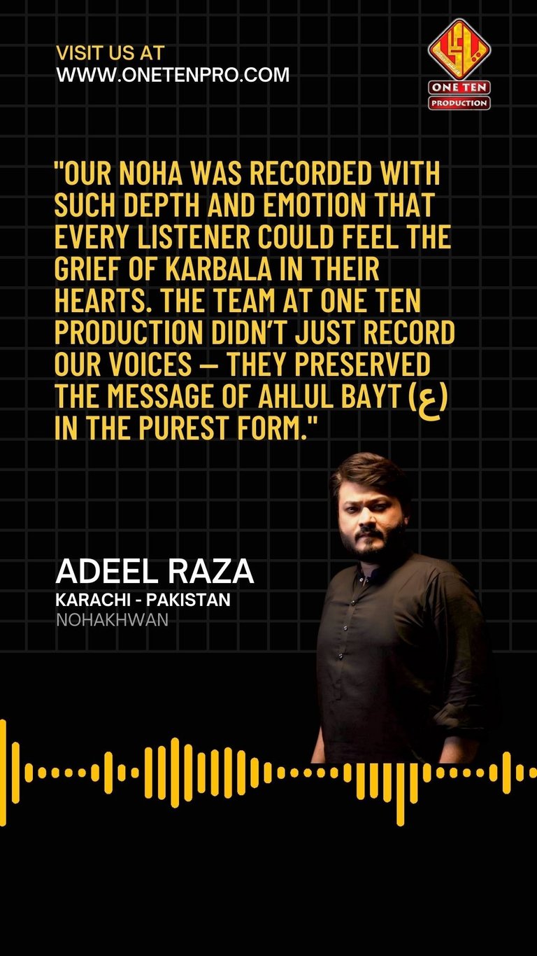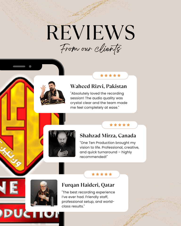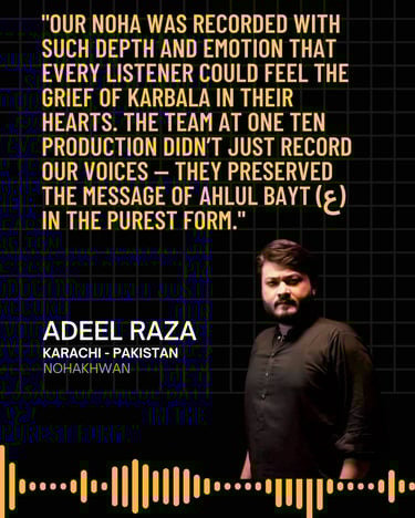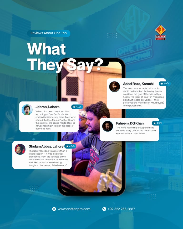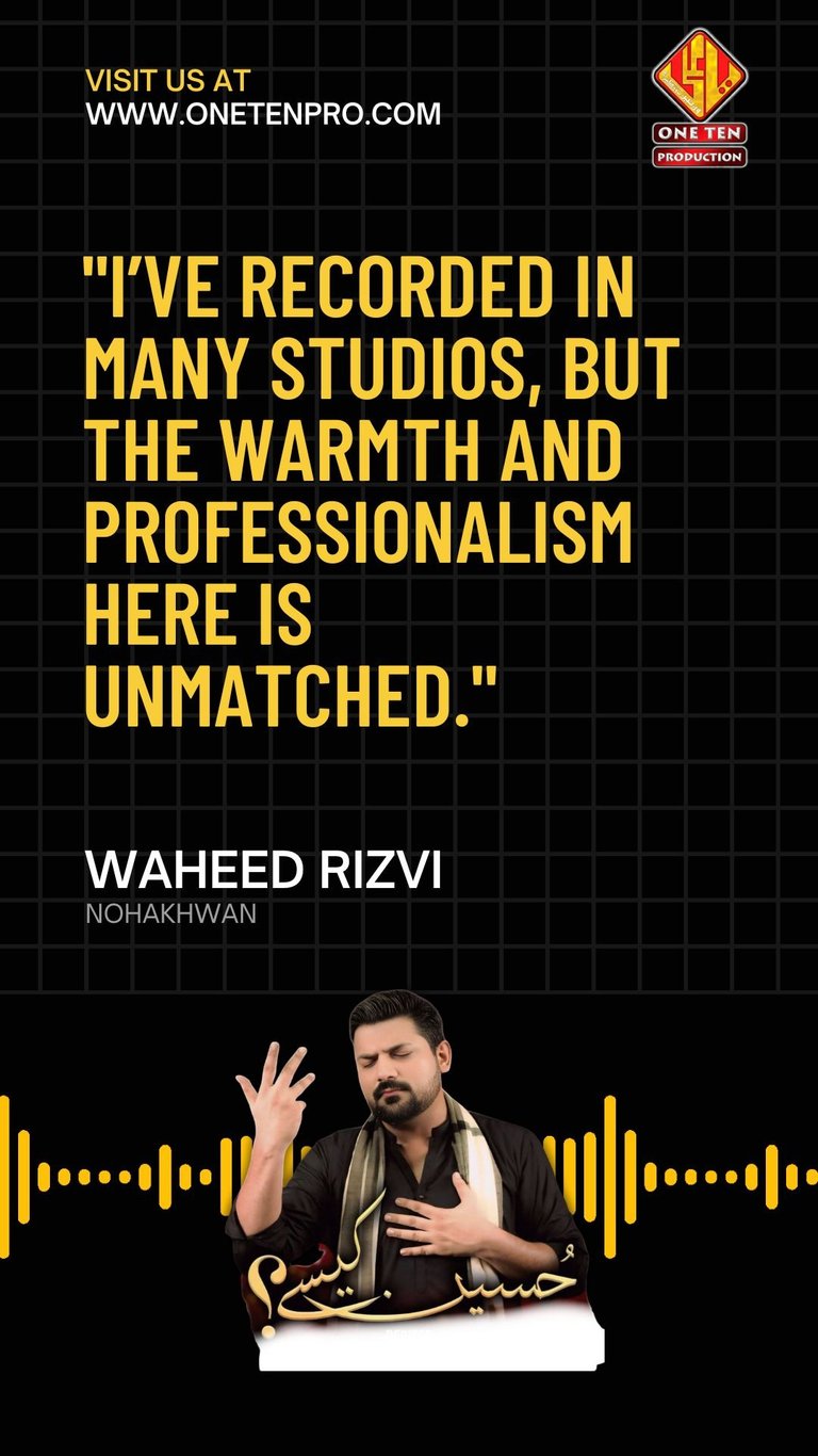 One Ten Production is a dynamic audio-video production company based in Karachi, Pakistan, operating state-of-the-art studios under the supervision of renowned nohakhwan Rizwan Zaidi — who has personally recorded over 600 nohay, naats, and manqabats, and supervised the recording of thousands of tracks by various acclaimed reciters from around the world. The company specializes in high-quality audio and video recordings, expert post-production editing, and creative graphic designing. The studios feature modern soundproof rooms, mixing consoles, editing suites, and a collaborative creative environment. The setting includes professional lighting, video cameras, audio equipment, and digital workstations. Showcase a team of passionate artists, sound engineers, video editors, and graphic designers working together in a polished, cinematic atmosphere — blending traditional culture with modern media excellence.