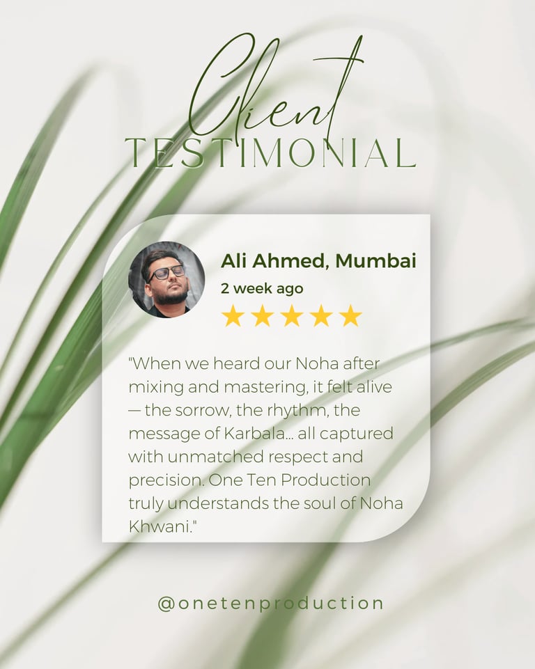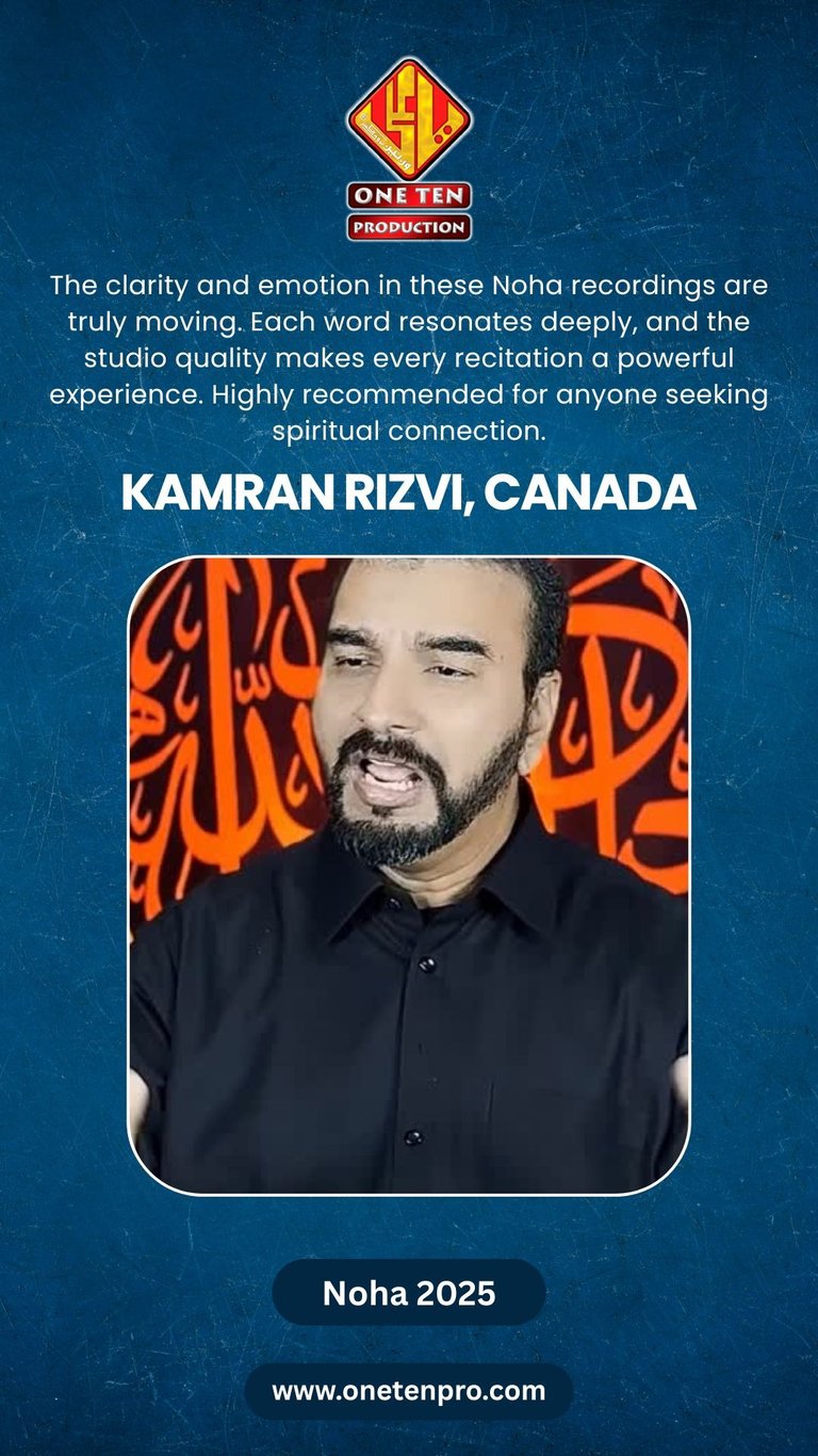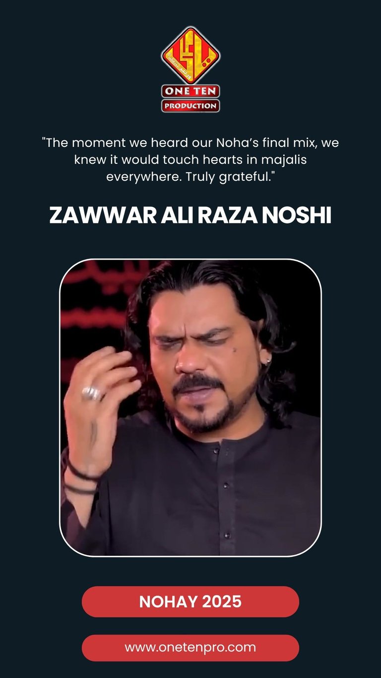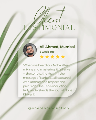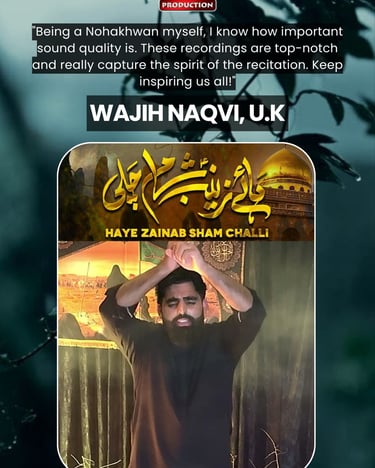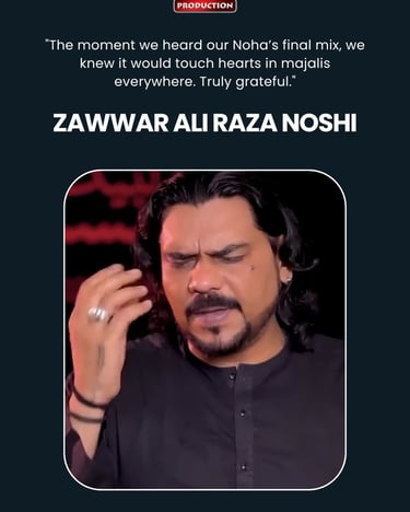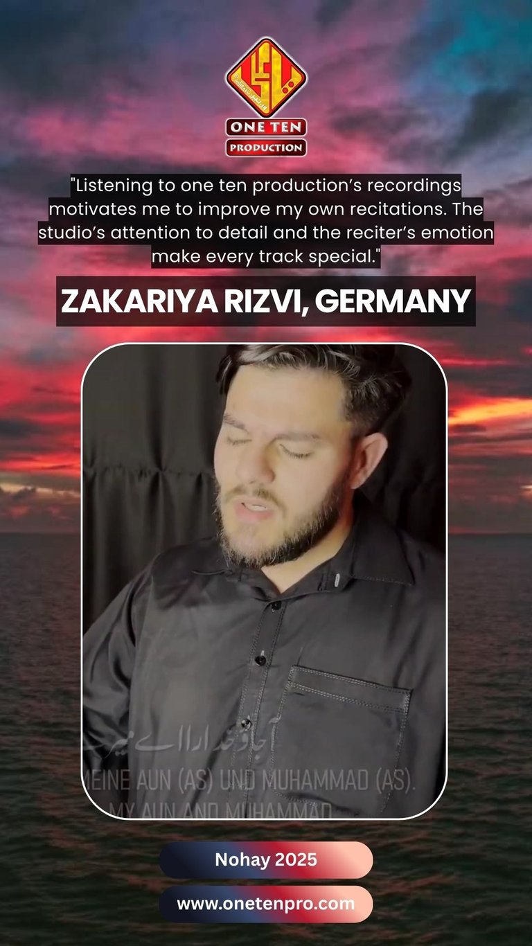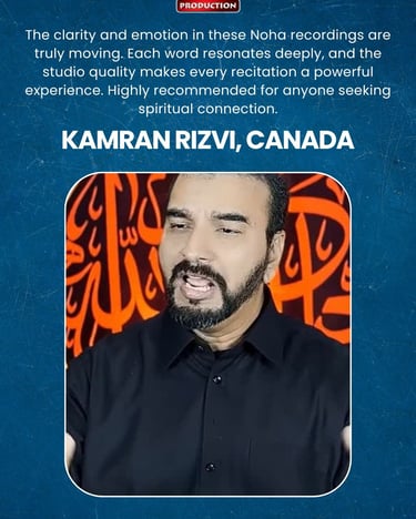 One Ten Production is a dynamic audio-video production company based in Karachi, Pakistan, operating state-of-the-art studios under the supervision of renowned nohakhwan Rizwan Zaidi — who has personally recorded over 600 nohay, naats, and manqabats, and supervised the recording of thousands of tracks by various acclaimed reciters from around the world. The company specializes in high-quality audio and video recordings, expert post-production editing, and creative graphic designing. The studios feature modern soundproof rooms, mixing consoles, editing suites, and a collaborative creative environment. The setting includes professional lighting, video cameras, audio equipment, and digital workstations. Showcase a team of passionate artists, sound engineers, video editors, and graphic designers working together in a polished, cinematic atmosphere — blending traditional culture with modern media excellence.